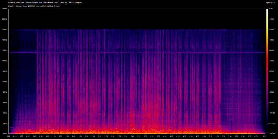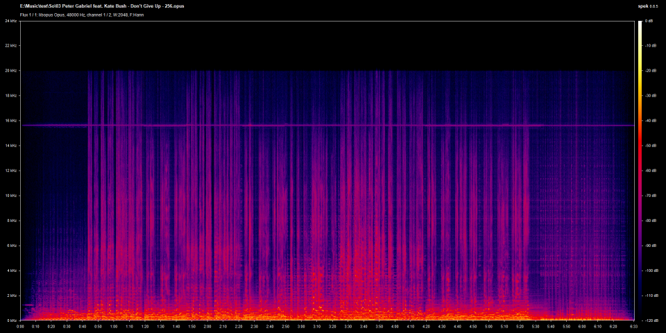 Voici le spectrogramme d'un OPUS en CBR 256, la meilleure qualité possible en CBR, pour un résultat de 12,453 Mo :