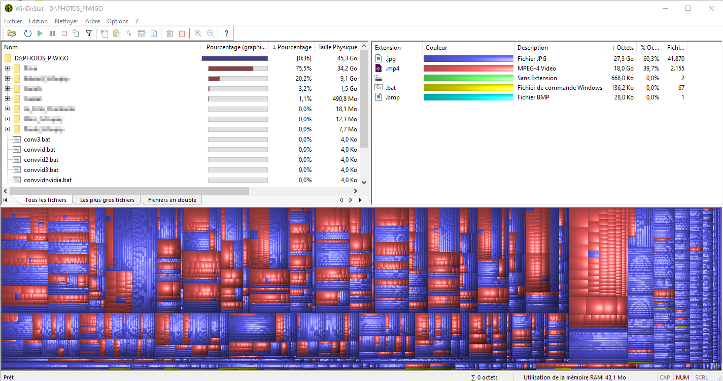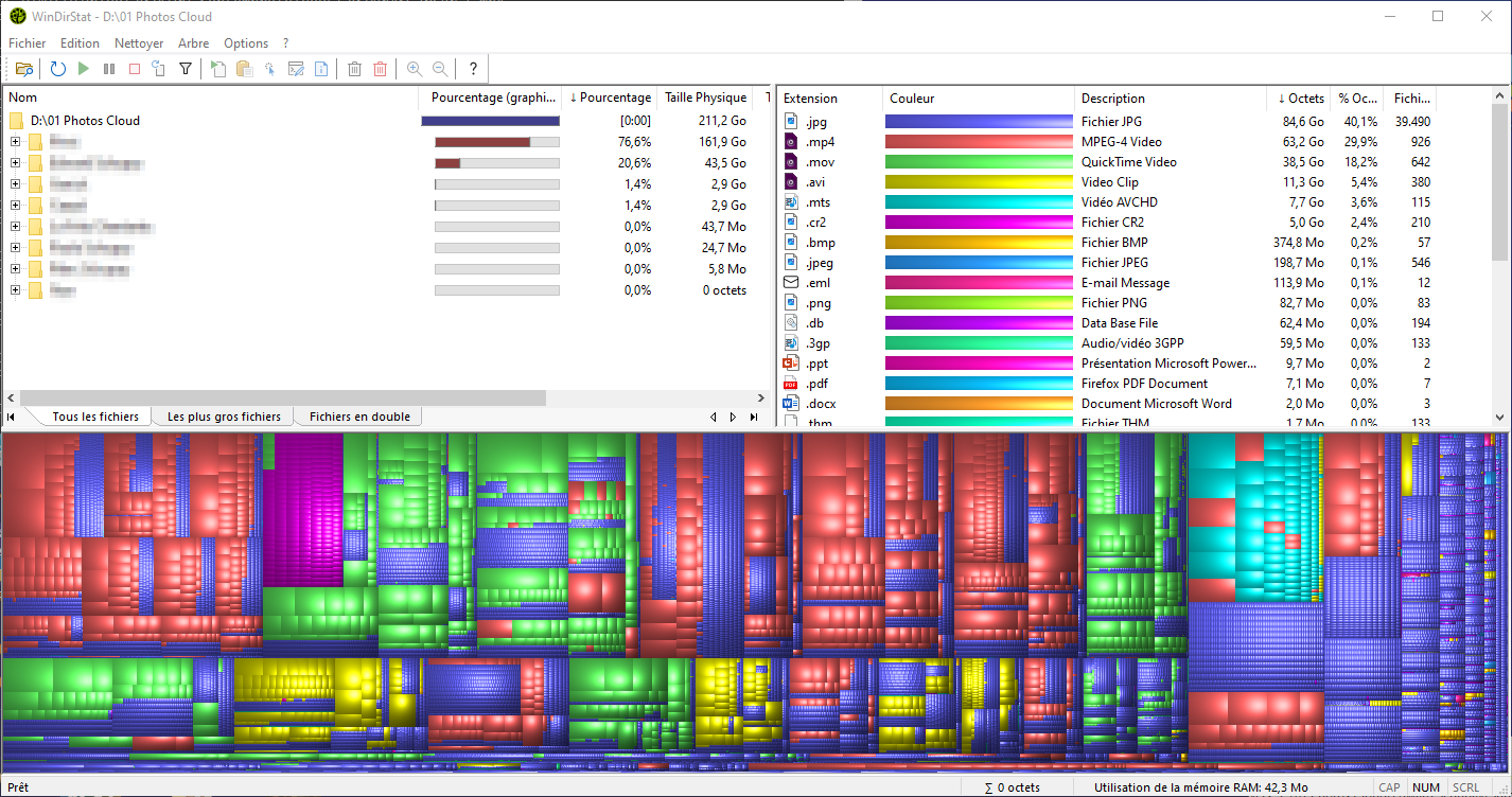 WinDirStat permet d'analyser la photothèque et de donner l'ensemble des types de fichiers présents, la taille de chaque type, etc.